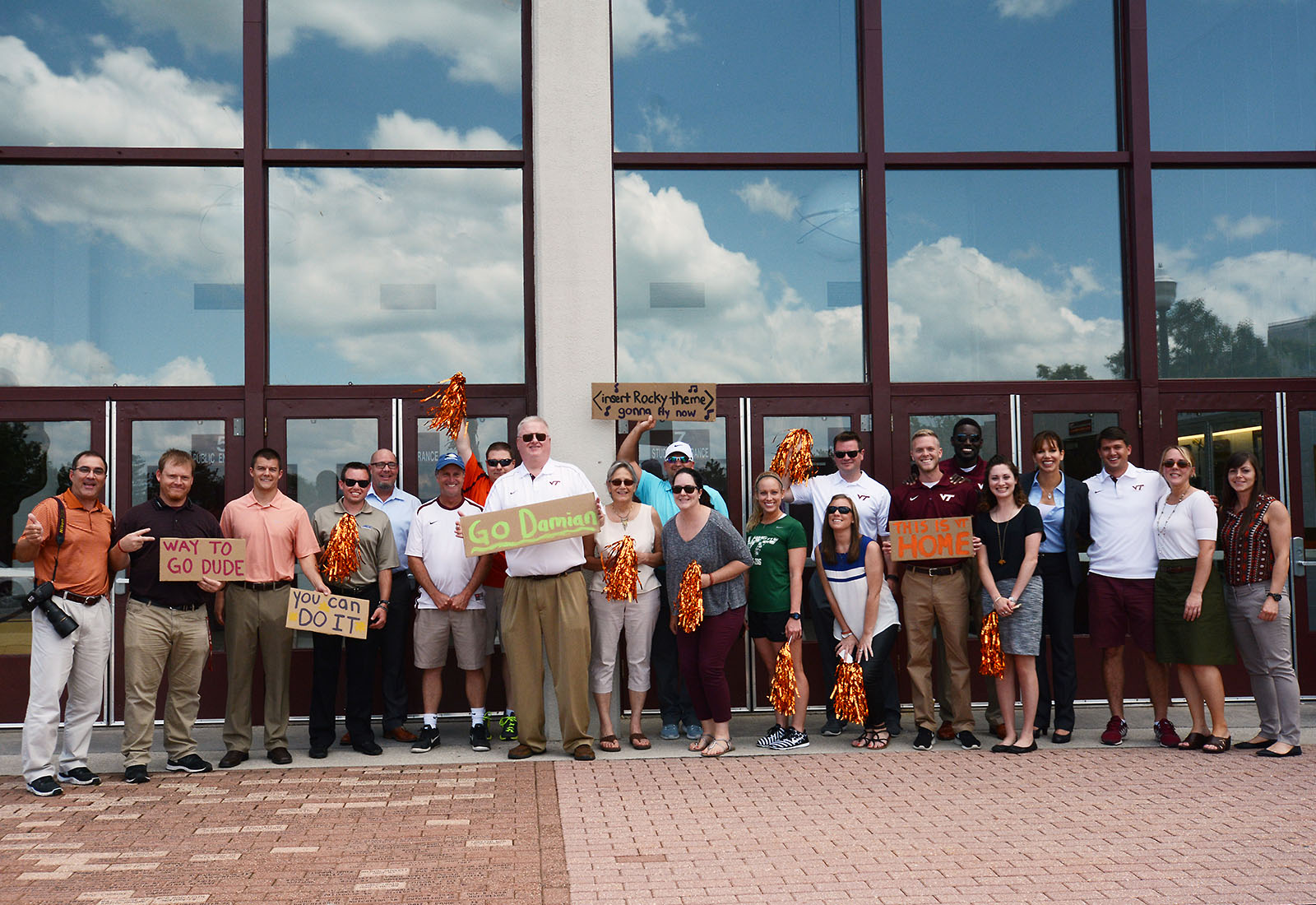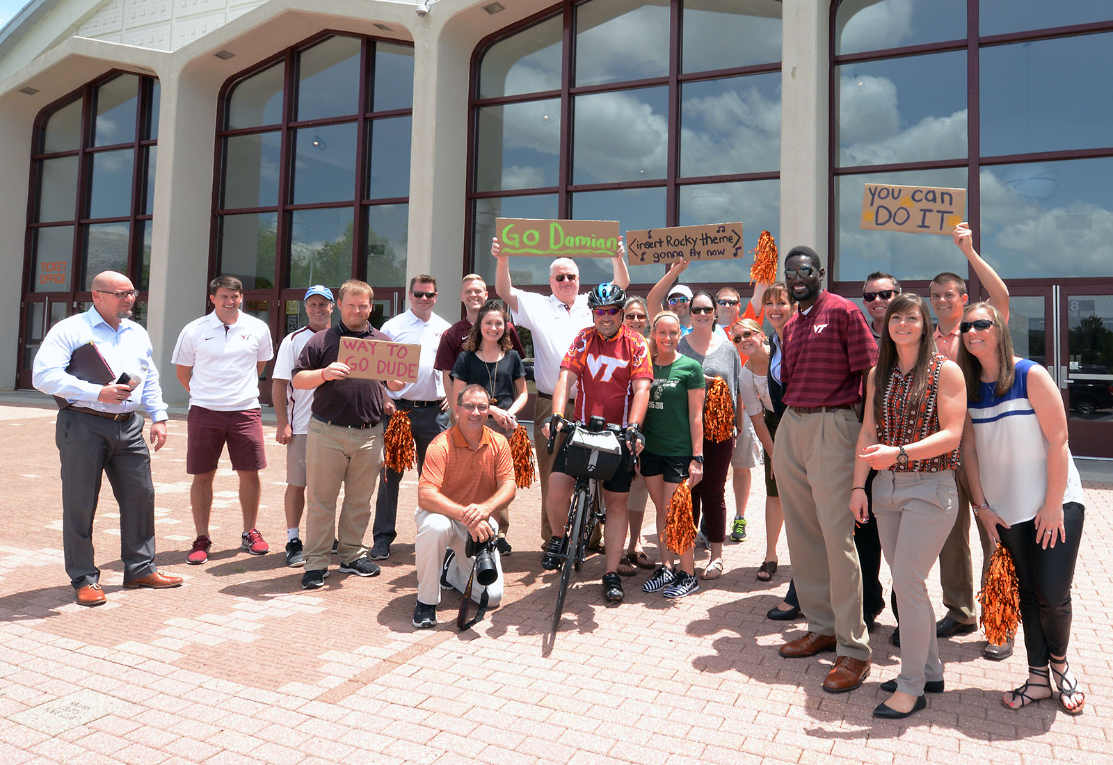 I made it to Hokie House and met up with some of the faster riders. It was getting close to the senior staff meeting starting time so at the urging of one of my co-workers I made the ride up to the office. As I come up over the hill on Washington Street to Cassell Coliseum I could see a large group of people outside. They had signs and pom-poms and it just took me by surprise. I rode up to them and just became overwhelmed by all the support they have given me.